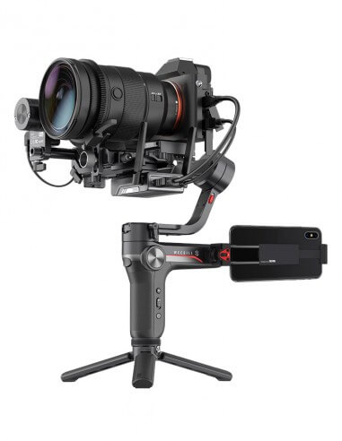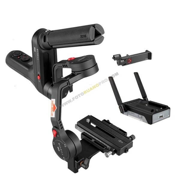 La nueva versión profesional de Zhiyum convierte a este estabilizador de gama profesional en una herramienta muy potente y con un volumen compacto. Un rendimiento mejorado  sobre versiones y modelos anteriores. para disfrutar al máximo de todas las posibilidades del estabilizador, este kit, el Pro Package, Que se suministra con el módulo de transmisión de vídeo y el soporte para smartphone.